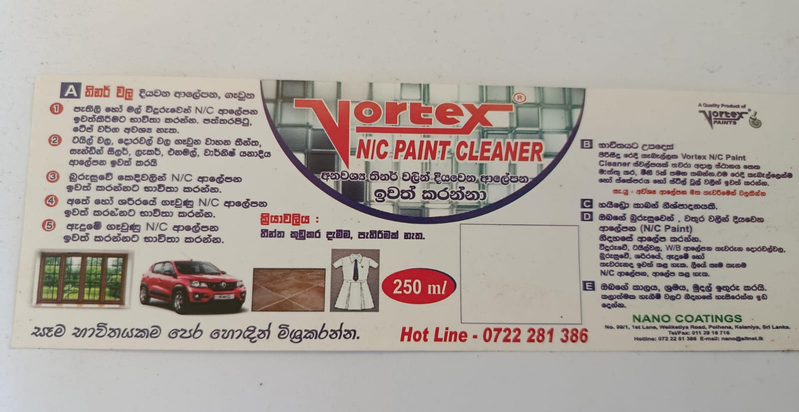 Be the first to review “අනවශ්‍ය තිනර් වලින් දියවෙන ආලේපන ඉවත් කරන්නා Vortex N/C Paint Cleaner 250ml”