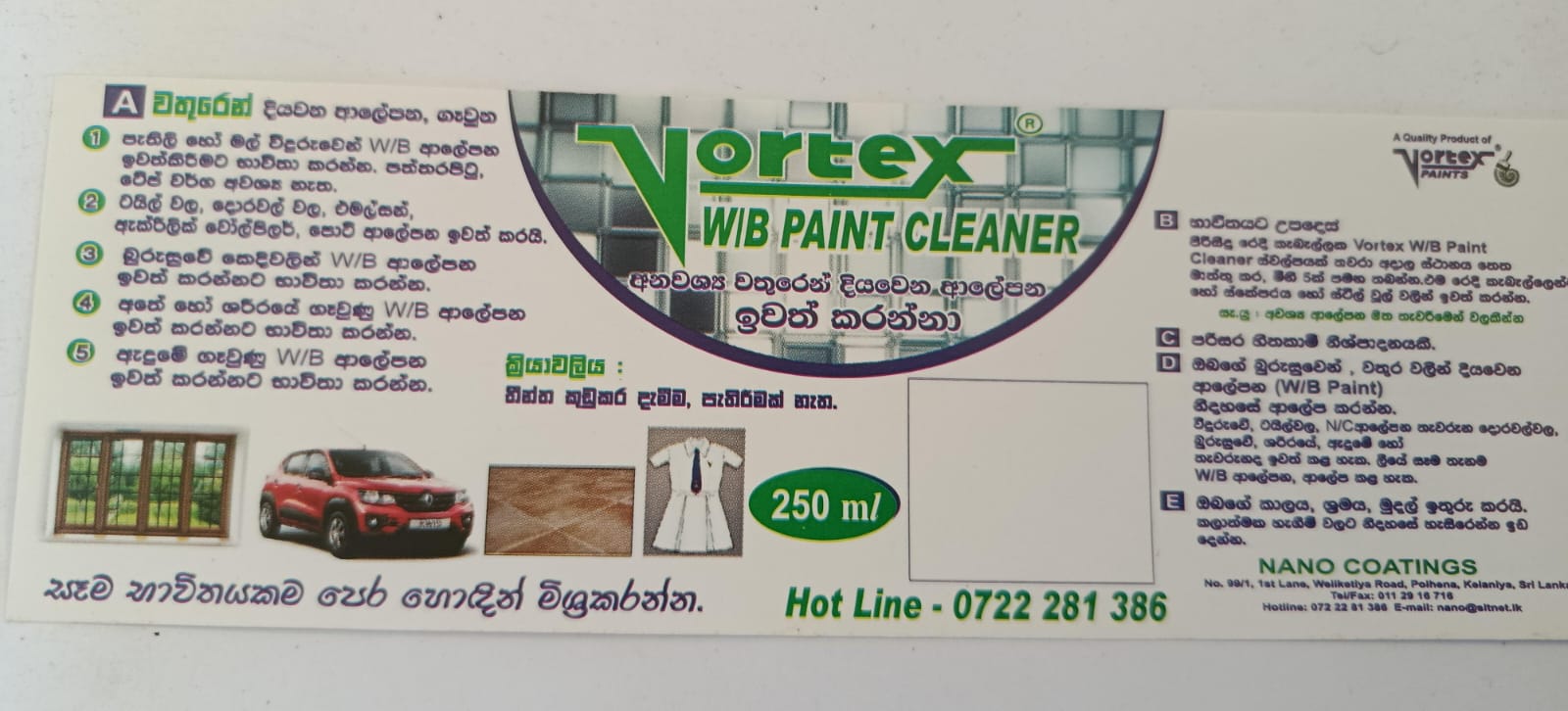 Be the first to review “අනවශ්‍ය වතුරෙන් දියවෙන ආලේපන ඉවත් කරන්නා Vortex W/B Paint Cleaner 250ml”